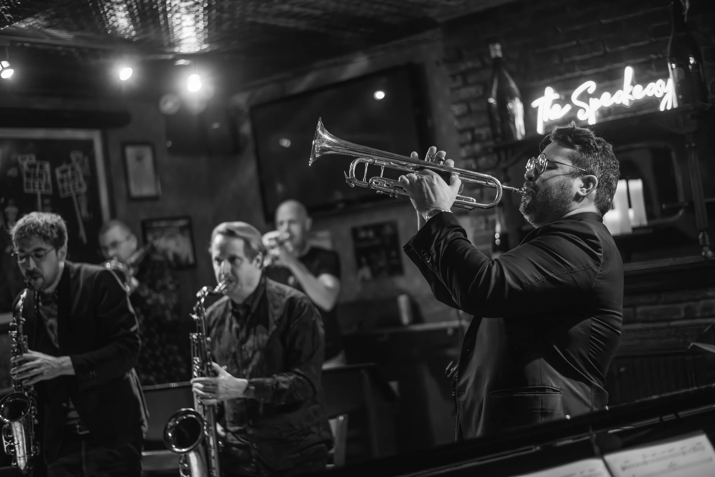 The nonet — affectionately branded “Augie Haas + 8” — is built on Augie’s love for the large-ensemble sound: rich brass harmonies, sculpted horn lines, and the thrill of nine musicians firing at once. The band pairs top-tier improvisers with razor-sharp arrangements that still leave room for spontaneity. When Augie isn’t soaring over the ensemble with his unmistakable trumpet voice, he’s connecting with the crowd, cracking a joke, or coaxing the band into a musical dare that pays off in real time.